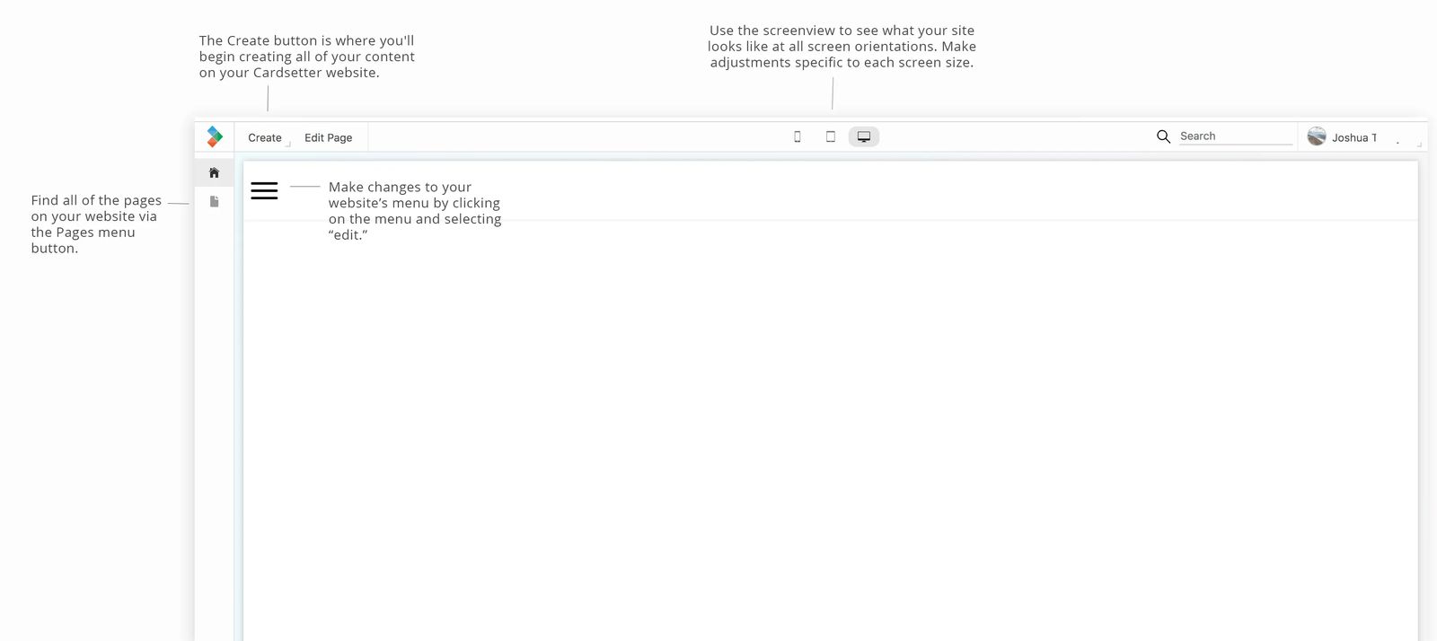 Screen View: At the top, you'll find the screen view options. Cardsetter lets you see what your site looks like for each screen view and you can also make adjustments to your site specific to each screen size.