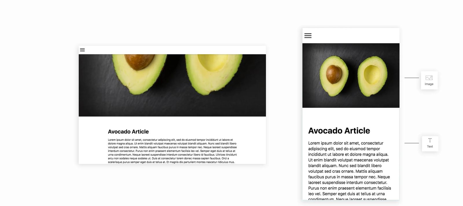 Text: The text block will input a text area that is centered on the page. If you're adding an article, this would be the right block to add to input your title and article copy.