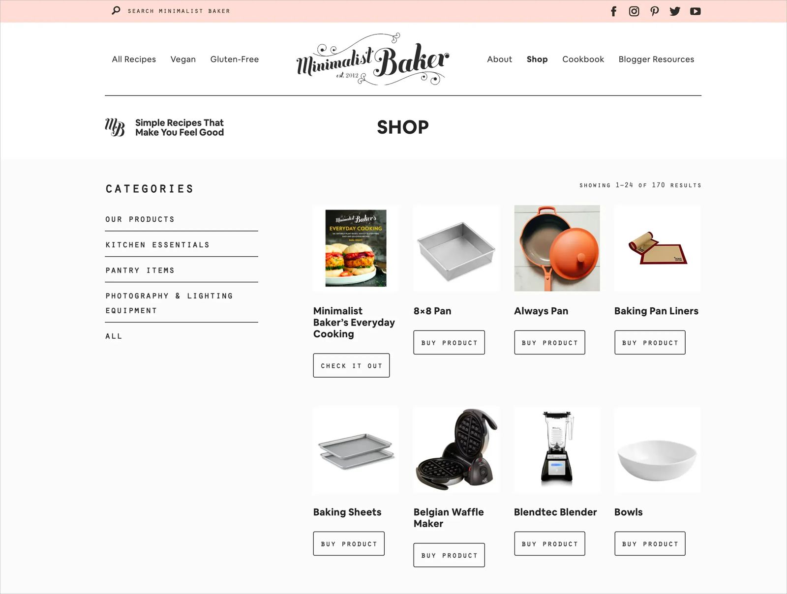 To complement the vast library of recipes included on the website, Minimalist Baker has many recommended products in their "Shop" section. Website visitors can find recommended pantry items, baking pans, kitchen gadgets, and more. The online shop comprises affiliate links, most going to Amazon. Still, like the Always Pan, a few others go right to the manufacturer's website for purchase. Always Pan likely has an internal affiliate program in which Minimalist Baker participates.