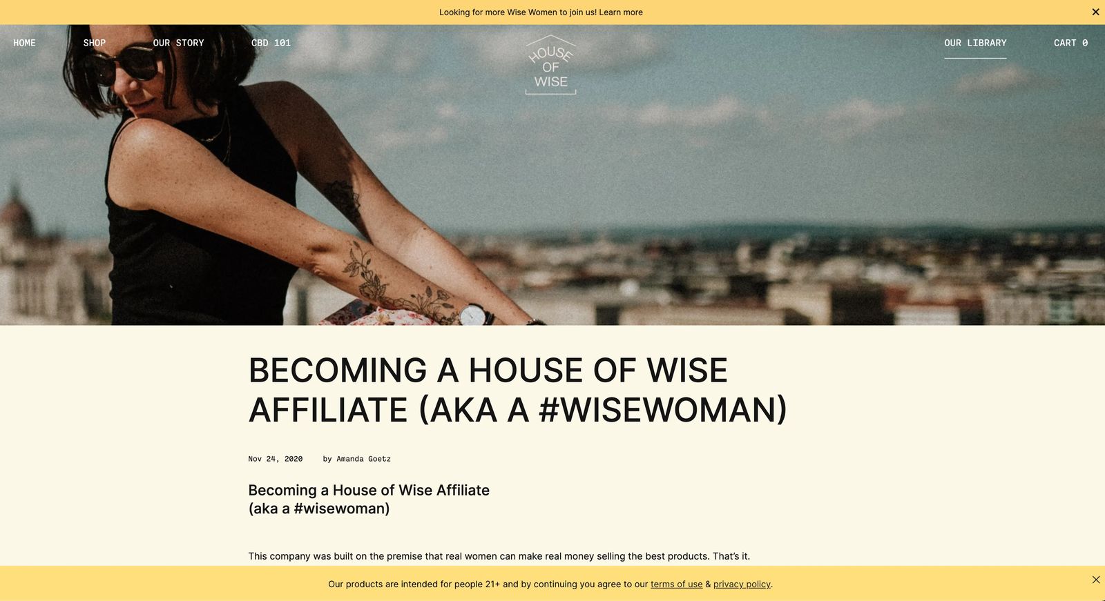 House of Wise is a CBD product line developed to help women with sleep, sex, and stress. Not only does the brand offer an affiliate program, but it's central to the company's marketing and revenue strategies. Affiliate partners carry the "Wise Woman" title. While affiliates are usually the ones touting and promoting brands on their social profiles, House of Wise reciprocates. They feature their "Wise Women" on the brand's social media profiles as well. House of Wise works to make their affiliates more successful by encouraging sales through their affiliates' links and cultivating their affiliate members through training, online meetups, and encouragement.