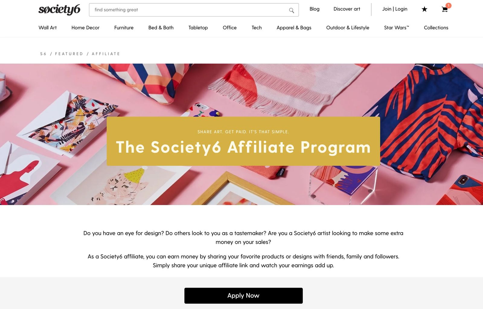 Society6 offers a 10% commission on purchases made within a 30-day window from affiliate links. Those who are interested in recommending their products can apply directly for the program.
