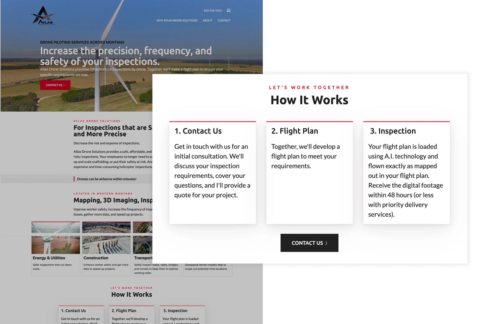 Atlas Drone Solutions provides drone flights and video recordings for inspections across many industries. The business keeps it simple by outlining how their service works right on their homepage.