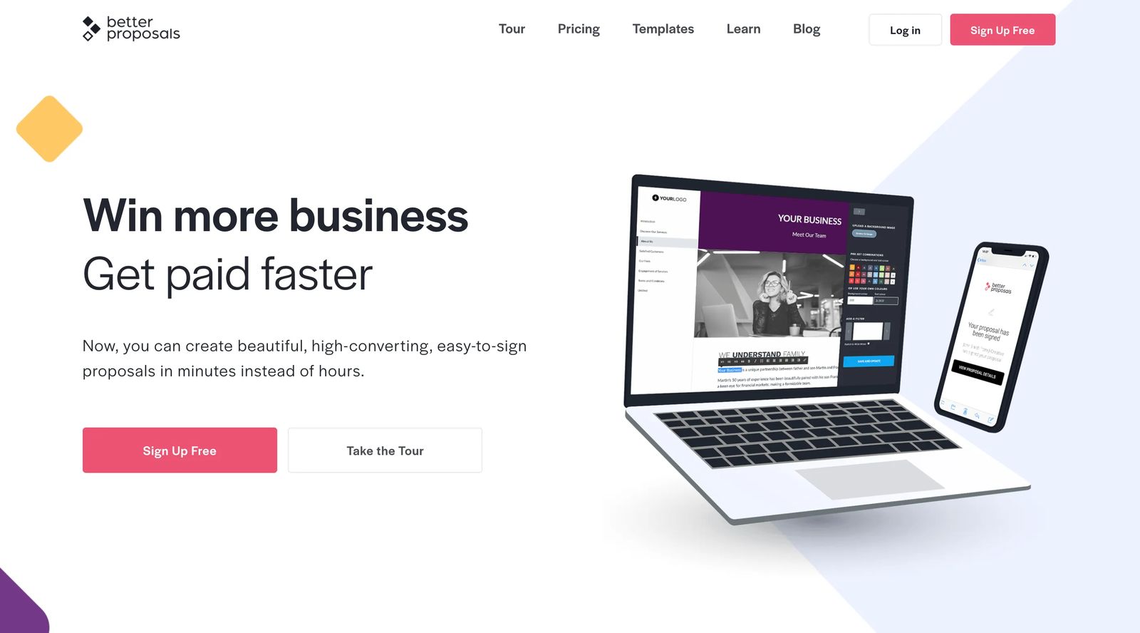 With Better Proposals, you can make great-looking online proposals quickly. Collecting an e-signature and payment from your clients is easy for you and easy for them.