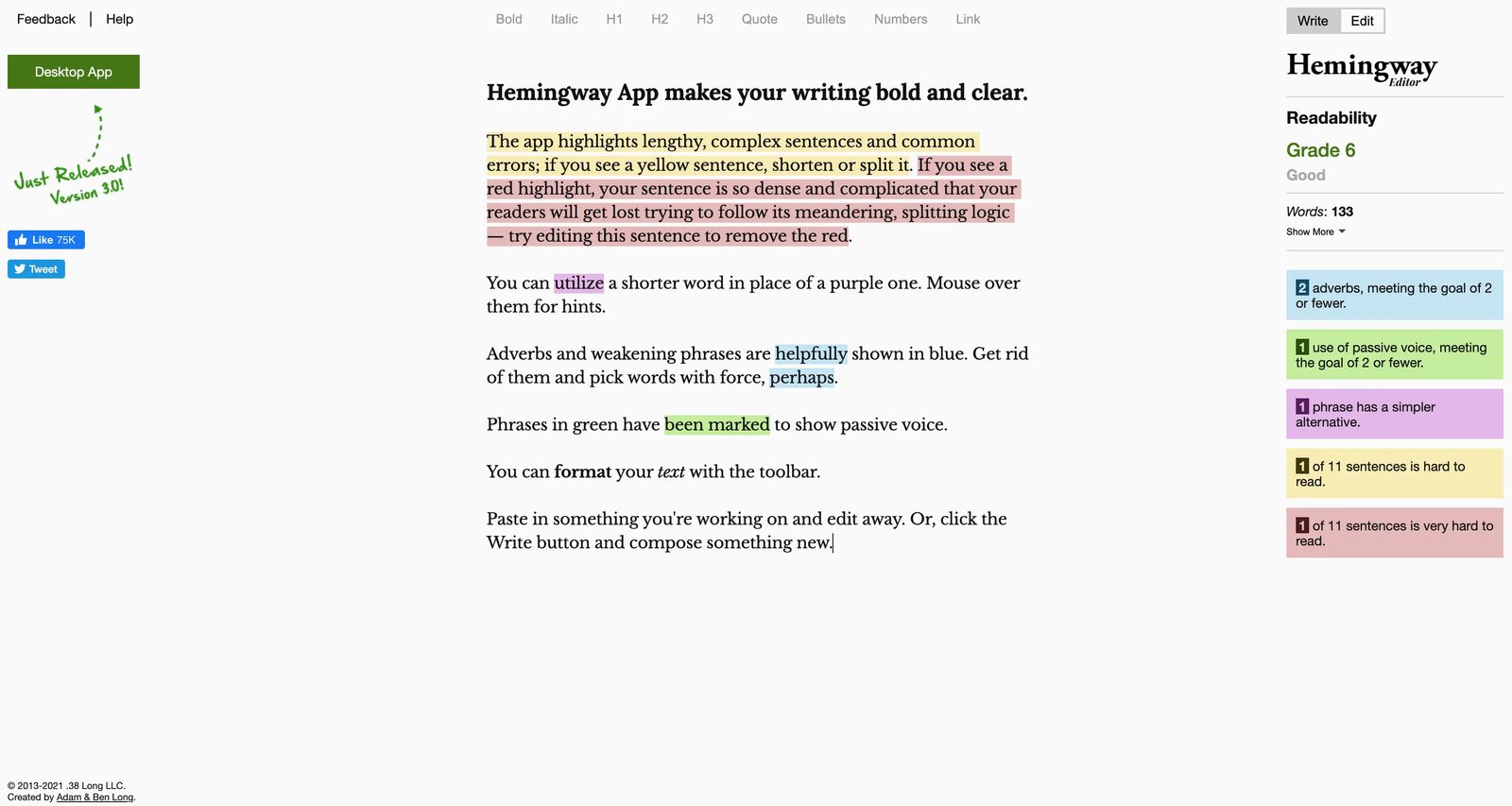 Hemmingway is a free app that will help to improve the readability of your writing.