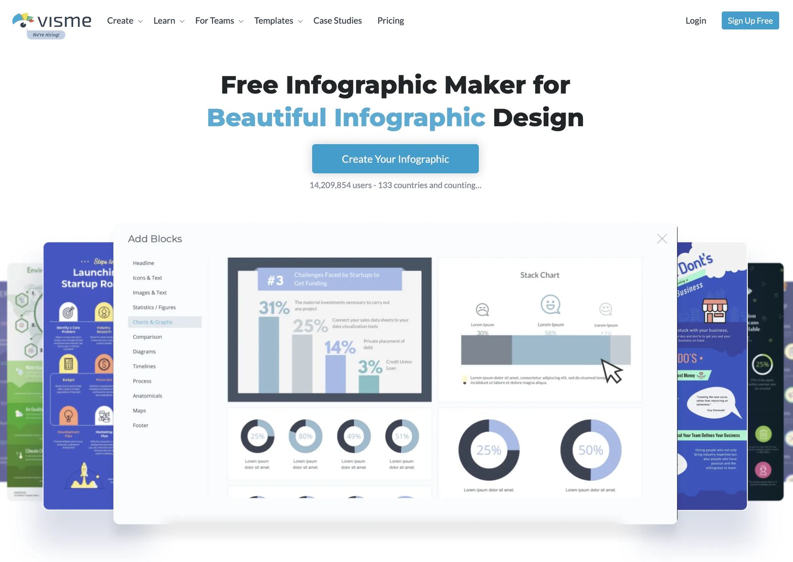Visme is a visual content creation tool that lets you create infographics, presentations, animations, and other forms of visual content. Visme is easy to use, yet can be used to create professional-looking assets with little to no design skills.