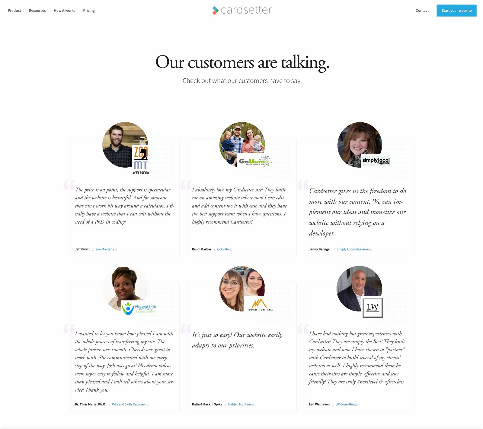 Cardsetter includes several testimonials on one page so visitors who are specifically looking for reviews can find them.