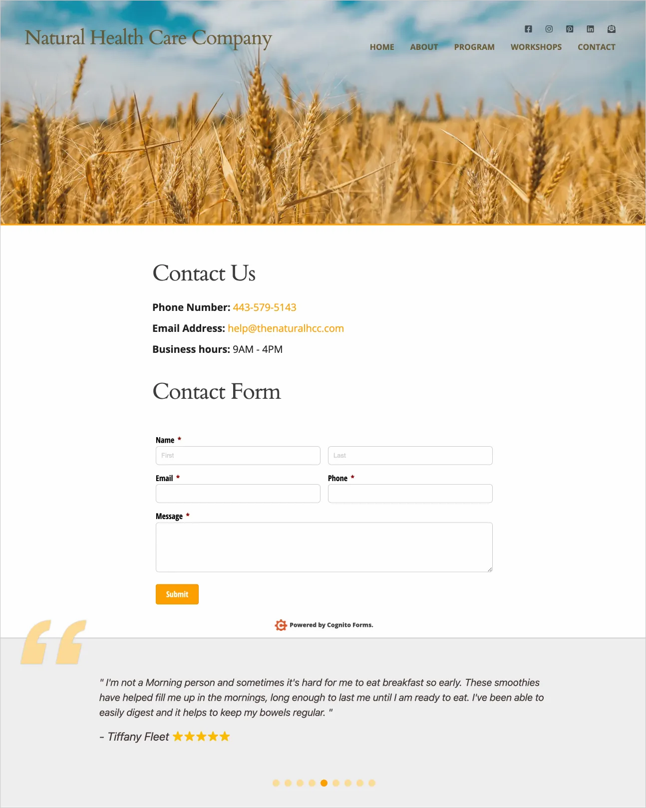 Natural Health Care Company features testimonials right below the contact form that highlight her clients' positive experiences.