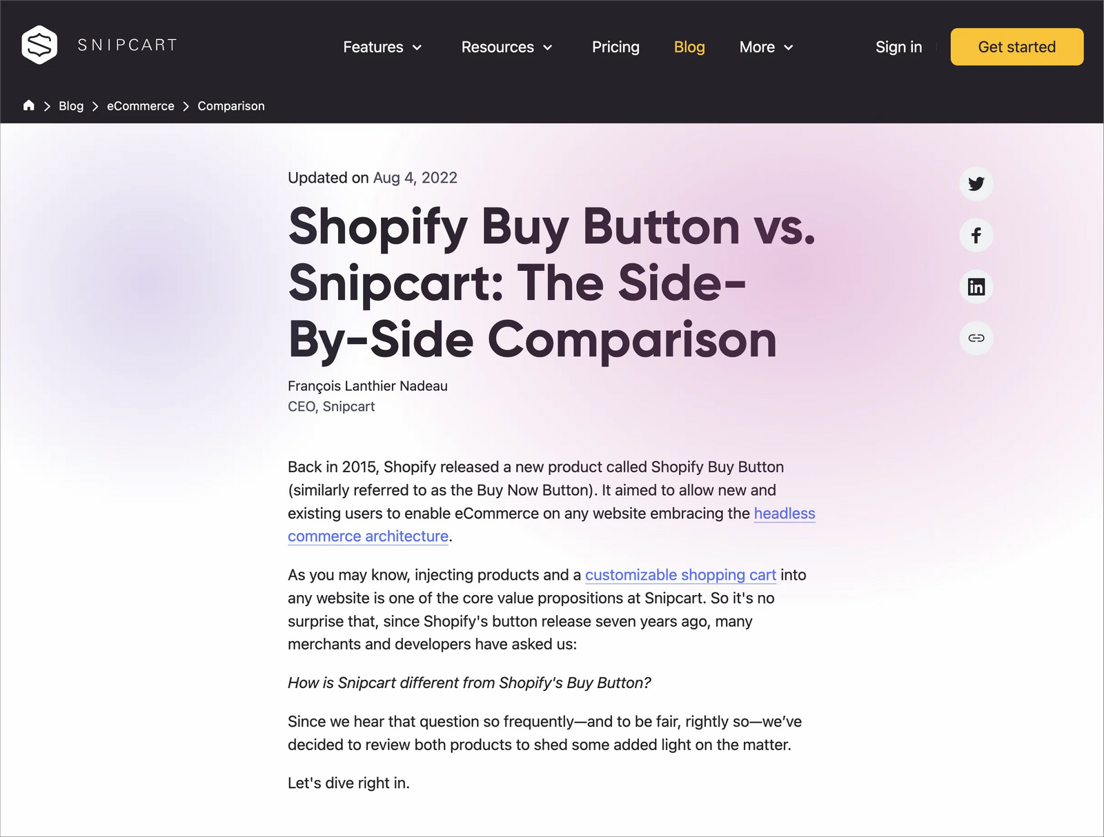 Snipcart, an e-commerce shopping cart tool, compares its product to Shopify's buy button. They know potential customers are making the comparison and address it head-on. Snipcart describes why and in what use cases Snipcart is the better choice!