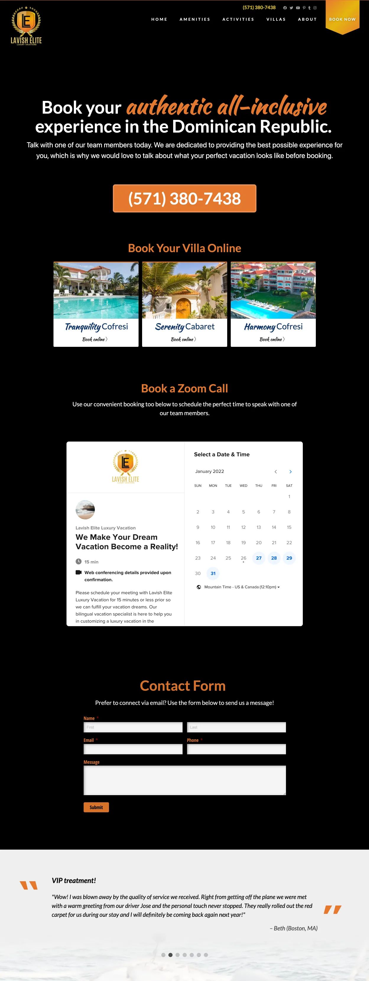 Lavish Elite Luxury Vacations offers incredible vacation lodging and experiences in the Dominican Republic. The company makes it easy for visitors to find contact information throughout the website with a direct booking option, phone number, contact form, and even the option to book a Zoom call. The company's social media profile links are in the header for easy access. Lavish Elite ensures that its vacationers can answer their questions and book their stay using their preferred communication channel.
