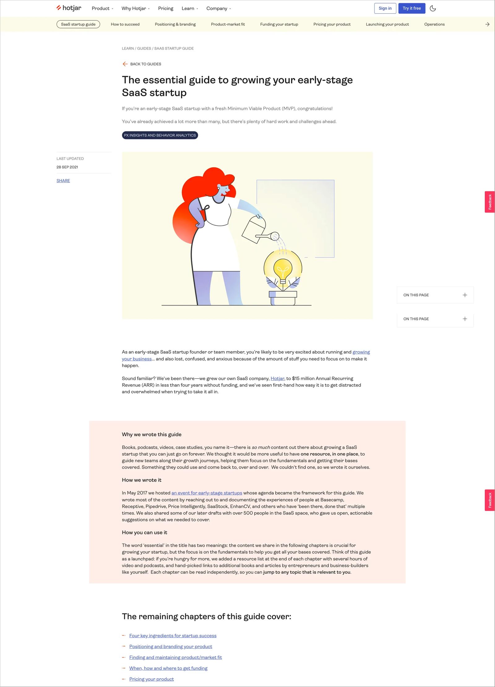 So, Hotjar features "The essential guide to growing your early-stage SaaS startup" on their website. The guide is comprised of ten valuable articles to help SaaS organizations.