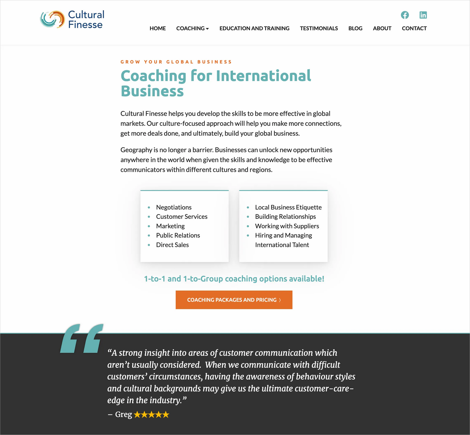 Rather than including a singular "services" page, it breaks its services out onto separate pages, including "coaching" and "education and training."