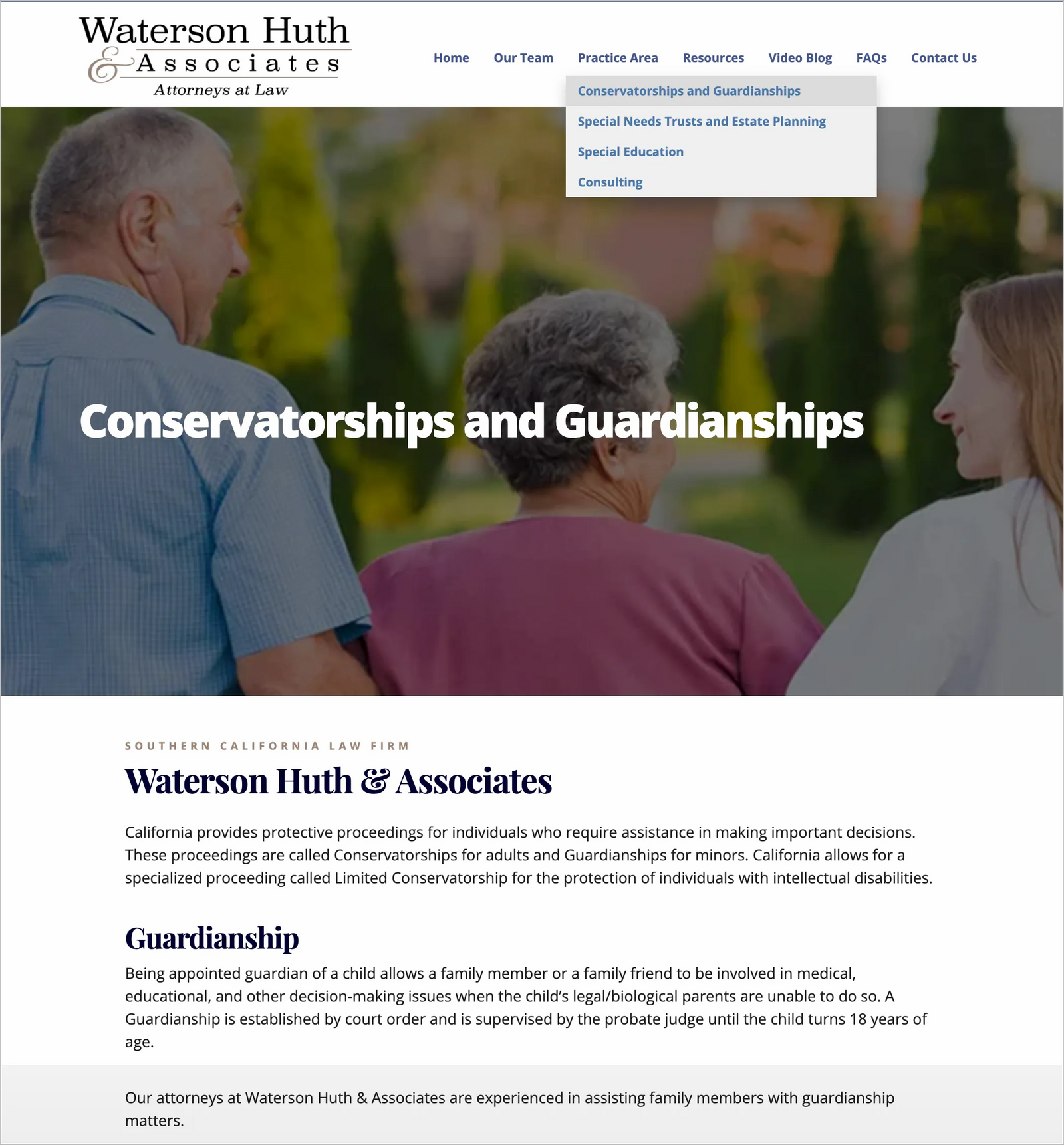 Law firms need to take a more serious (and less sales-y) tone on their websites. It's crucial to appear highly professional, knowledgeable, and trustworthy. Waterson Huth & Associates helps people with special needs and their families navigate guardianship, conservatorship, estate planning, and more.