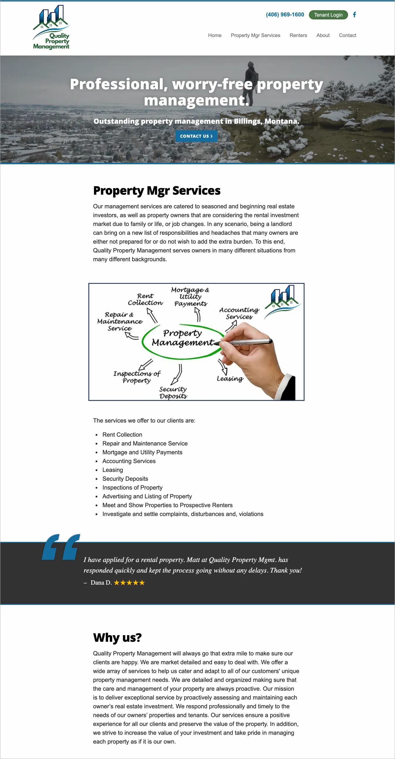 This services page educates, informs, and sells. It lists out the specific operational functions handled by Quality Property Management. It includes a testimonial. The page ends with why a property owner should choose Quality Property Management over others. The call to action button is present on every website page, including the services page.