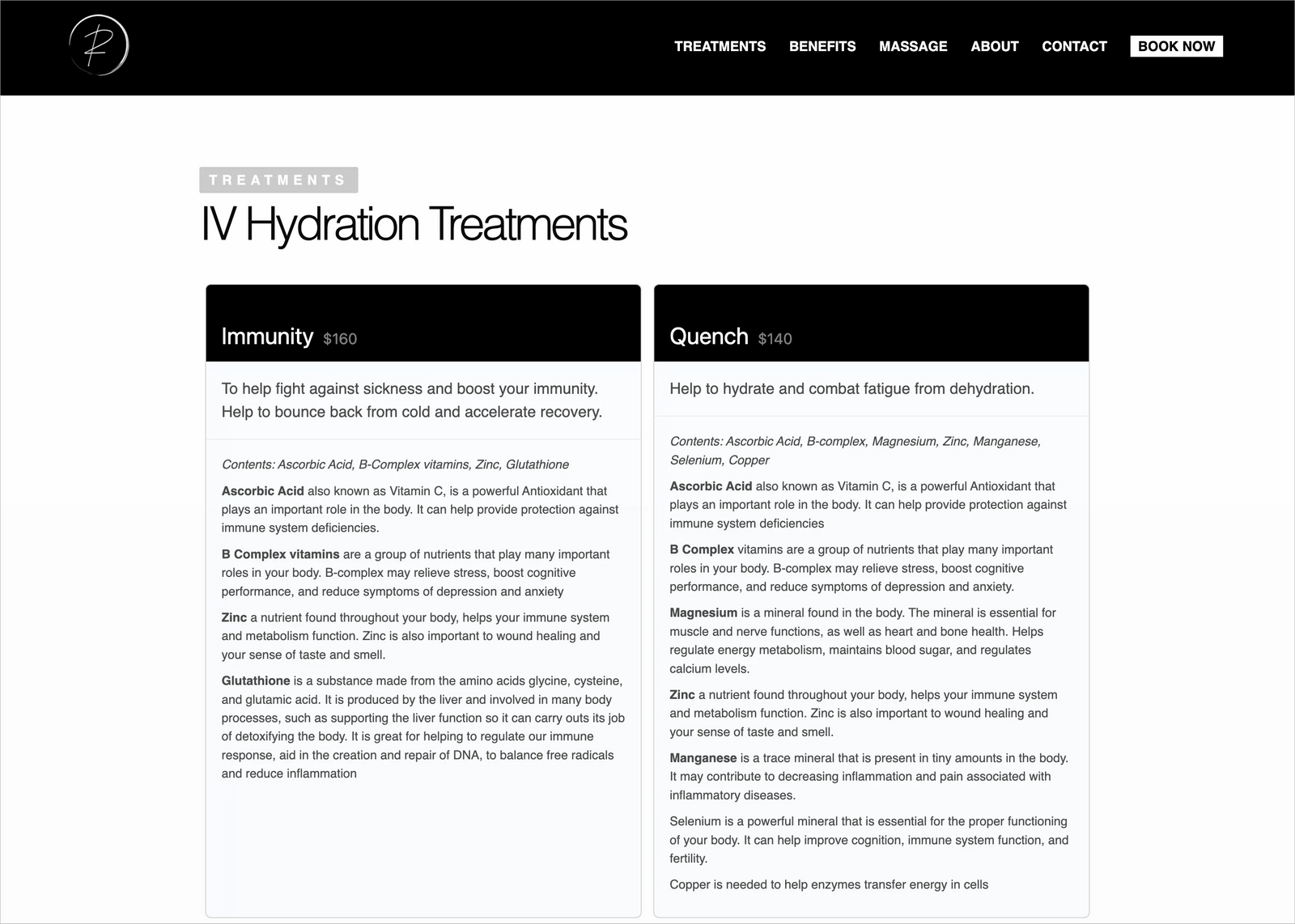 Revive IV and Wellness is a medical therapy spa with restorative IV treatments. The treatments page on its website outlines its services and provides pricing.