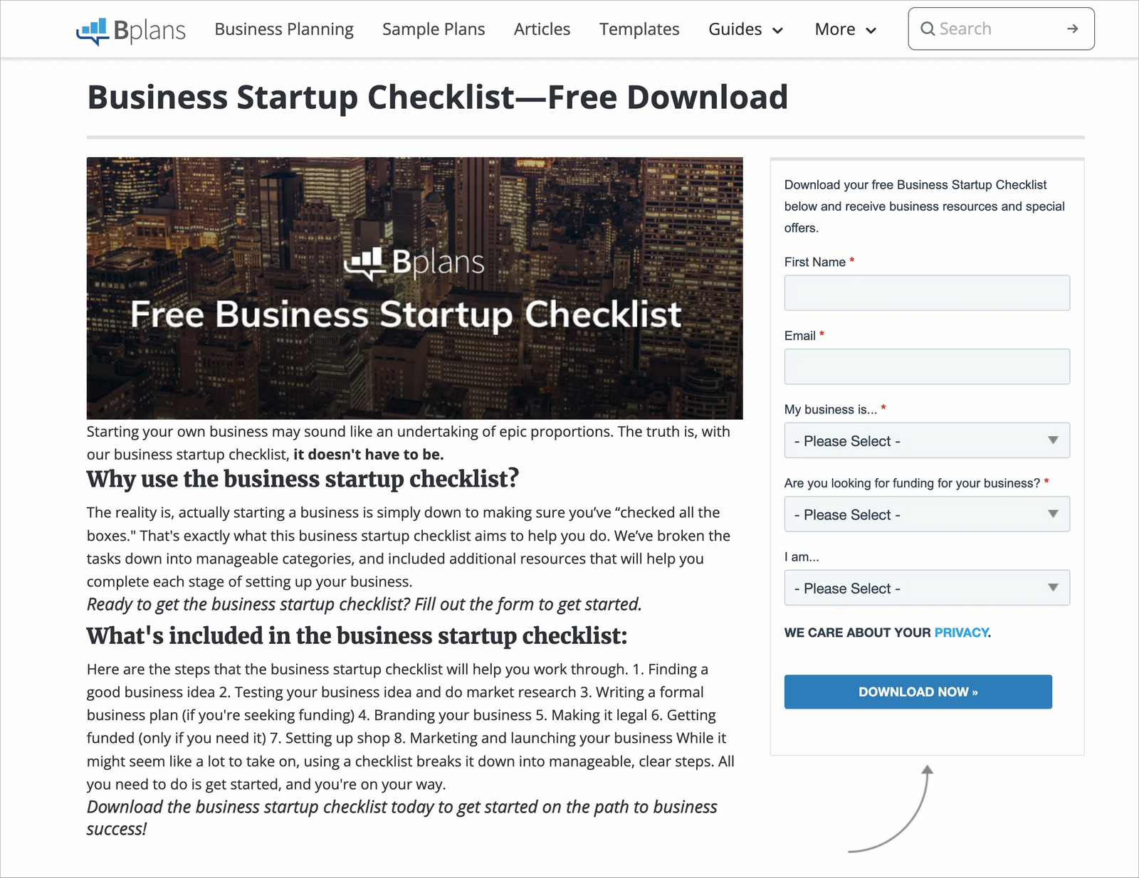 Bplans.com features a free checklist for startup businesses. People who download the free resource are qualified leads for the company's business planning software.