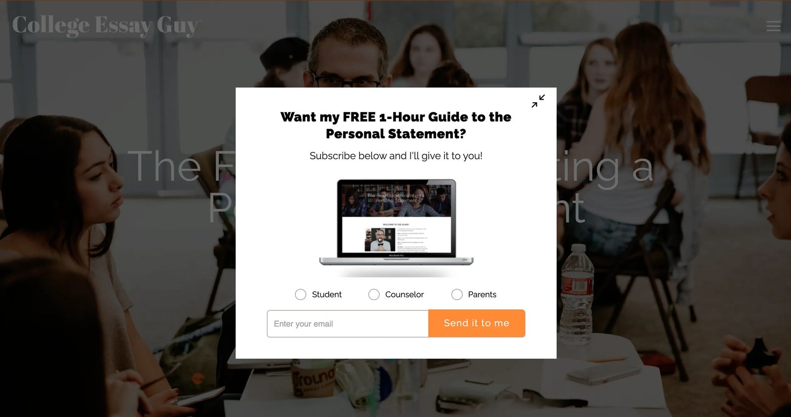 The College Essay Guy helps students with a "free guide to writing a personal statement." Students can improve their college essays with the free guide and later sign up for one of his paid courses or consulting packages to create "awesome" college applications.