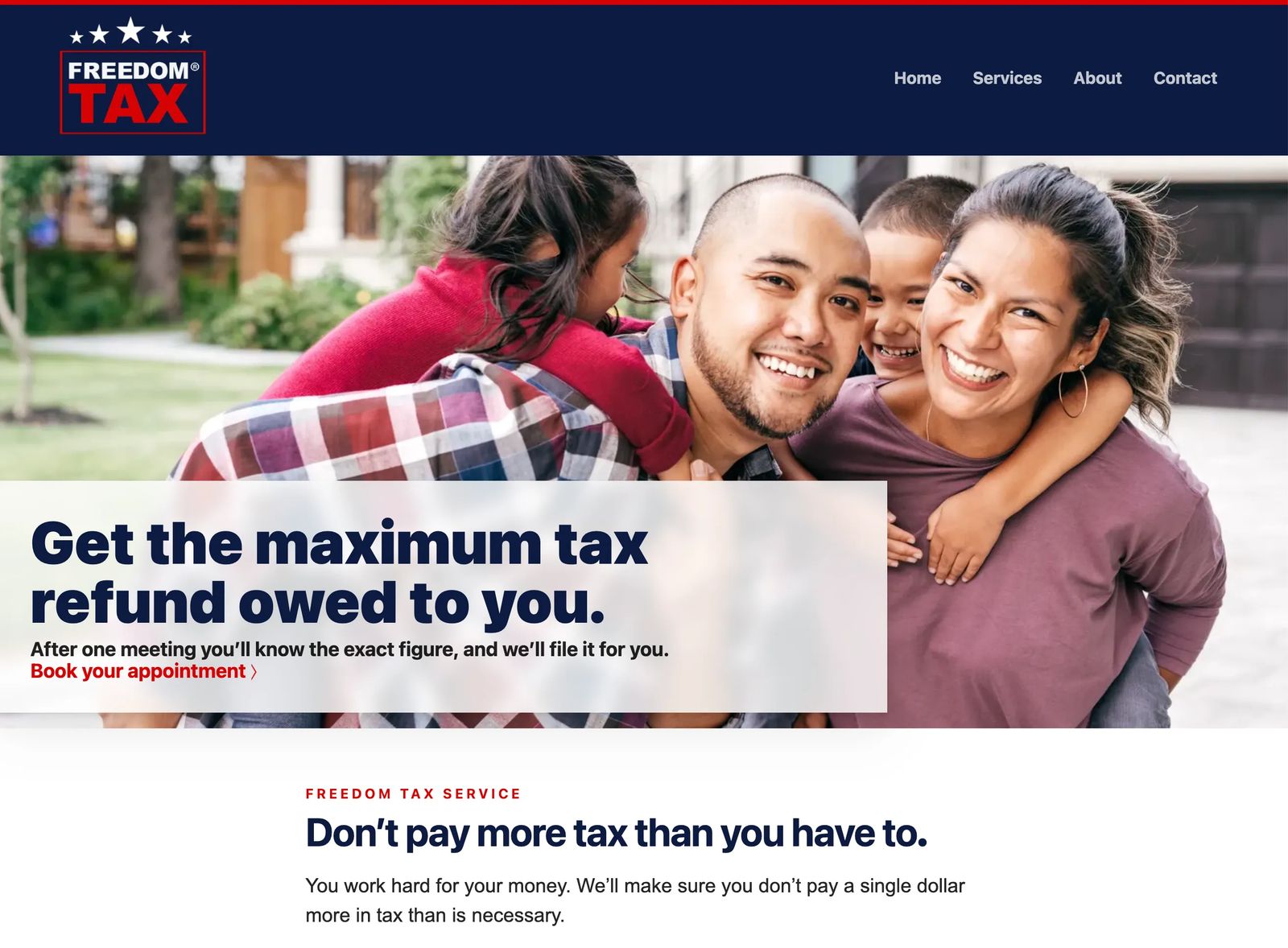 The Freedom Tax website quickly communicates the benefits of using their tax filing service –"Get the maximum tax refund owed to you." The design is free of clutter and easy to read and navigate. Freedom Tax tells the website visitor what to do to get started – to "book an appointment."