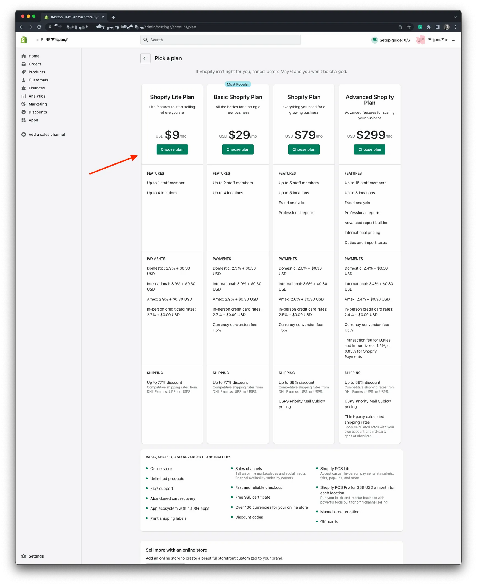 Follow the steps below to downgrade your Shopify plan to Shopify Lite. Cardsetter's integration with Shopify uses Shopify's "Buy Button" sales channel, which only requires Shopify's Lite plan.